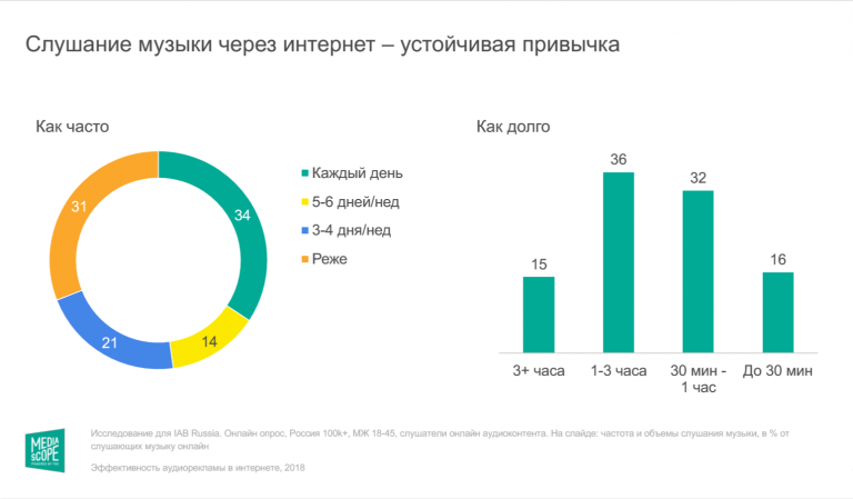 Из 850 опрошенных в сентябре и октябре 2018 года пользователей в возрастной группе от 18 до 45 лет большинство заявили, что не пользуются блокировщиками рекламы. Респонденты также отметили, что слушали аудиоконтент онлайн за последние 30 дней и пользуются хотя бы одним бесплатным каналом получения информации в интернете. Данные актуальны для жителей городов с населением, превышающим 100 тыс. человек.