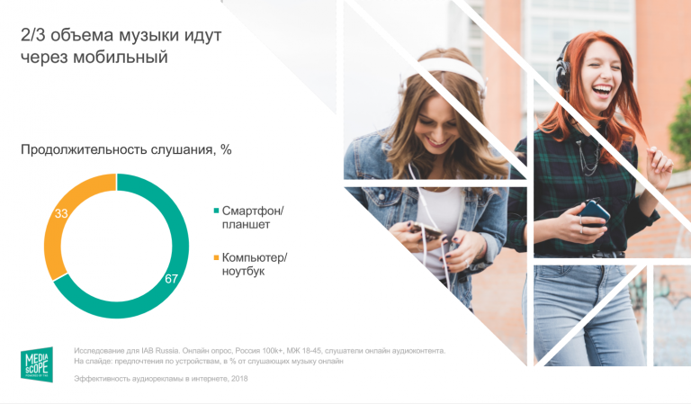 При этом 2/3 объёма прослушанной музыки идут через мобильные устройства — лишь треть опрошенных использует для этих целей компьютер или ноутбук