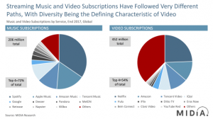 Также фирма указала на концентрацию рынка музыкальных подписок среди всего нескольких компаний: «Четыре наиболее популярных сервиса подписок имеют аудиторию в 72% от общего числа пользователей, для видео это 54%. И если список музыкальных сервисов не очень длинный, то в видео индустрии существует большое количество более мелких сервисов: только в США оперируют около 60». В Midia добавили, что многие из них являются нишевыми сервисами, от корейской драмы и хоррора до реалити-шоу, с 23 разными ценовыми точками.