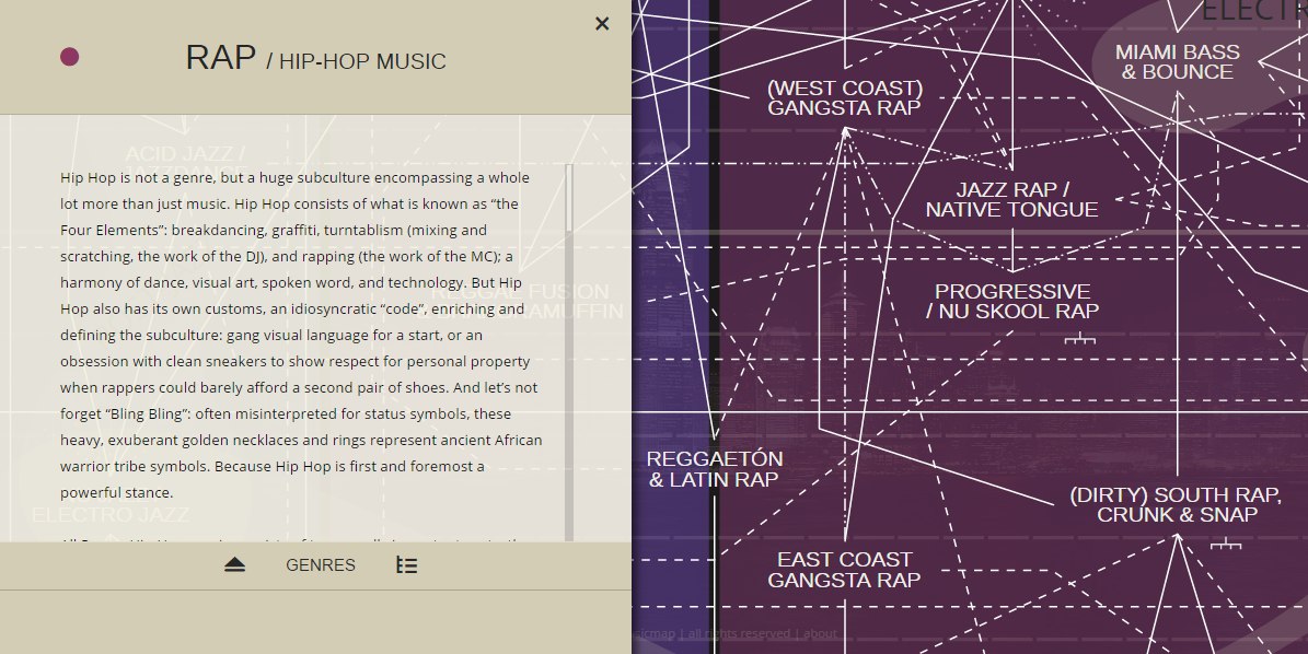 Бельгиец Квинтен Крауэлс (Kwinten Crauwels), создал один из самых подробных путеводителей по музыкальным направлениям — MusicMap. Интерактивная карта включает в себя 234 музыкальных стиля, охватывая период с 1870 по 2016 год.