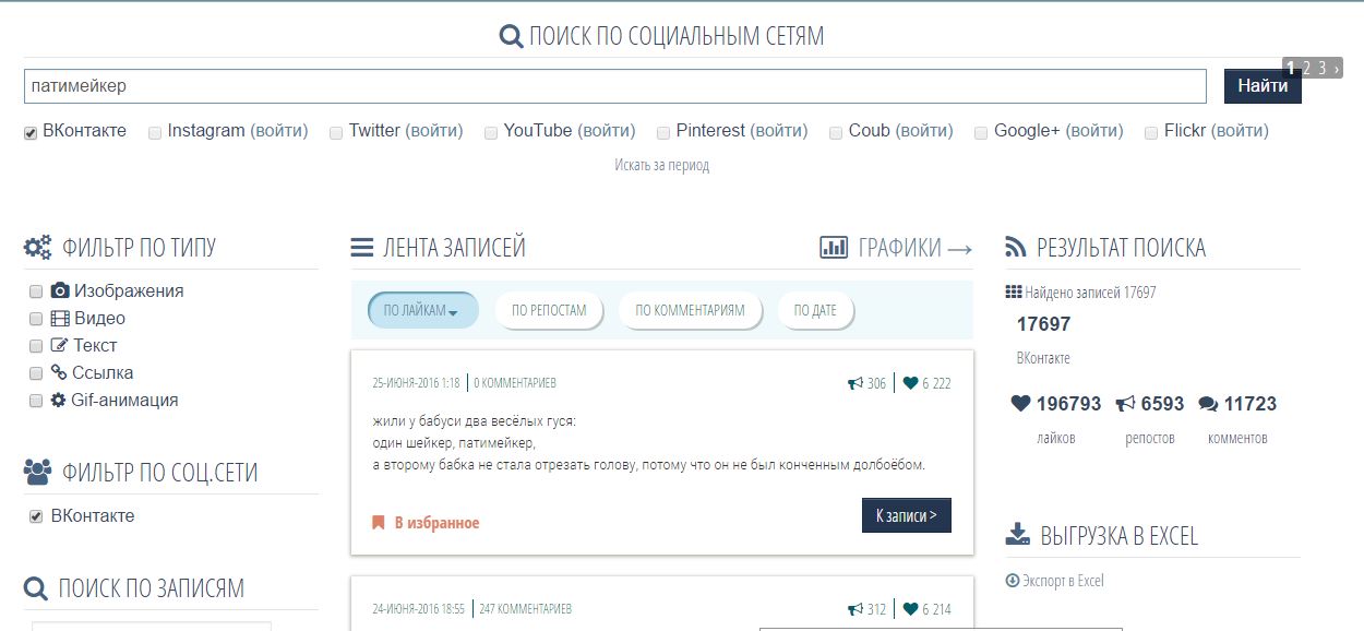 Контакт является социальной сетью номер один в России и во всем СНГ. Цифры, приведенные ниже – из сервиса Popsters, который показывает, сколько новостей (стены людей\пабликов\групп +комментарии) без привязки к временному периоду было опубликовано с тем или иным словом. Взял запрос «Патимейкер« и сравнил с другими.