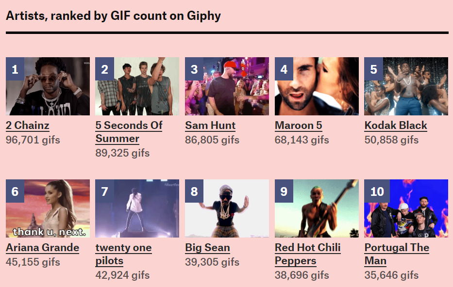 Журналисты агентства The Pudding опубликовали исследование «Who is the Biggest Pop Star?», в котором попытались найти альтернативу традиционным способам измерения популярности артиста — подсчётам продаж альбомов, синглов, стримов и количества ротаций на радио. Вместо этого авторы составили рейтинги звёзд по количеству гифок, упоминаний на сайте Reddit и подписчиков в соцсетях, а также по размеру концертных площадок, на которых они выступали и количеству просмотров на YouTube. Результаты оказались не такими предсказуемыми. К примеру, в рейтинге GIF-картинок лидирует 2 Сhainz.