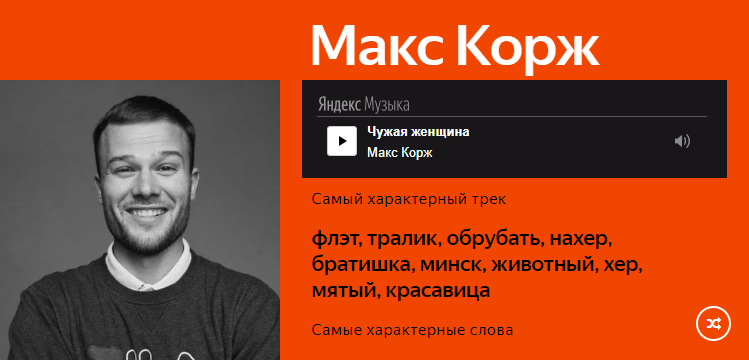 Аналитики Яндекса нашли характерные слова не только для жанра в целом, но и для отдельных его представителей, а затем нашли для каждого трек с самым высоким содержанием таких слов. Например, для Макса Коржа это песня «Чужая женщина».