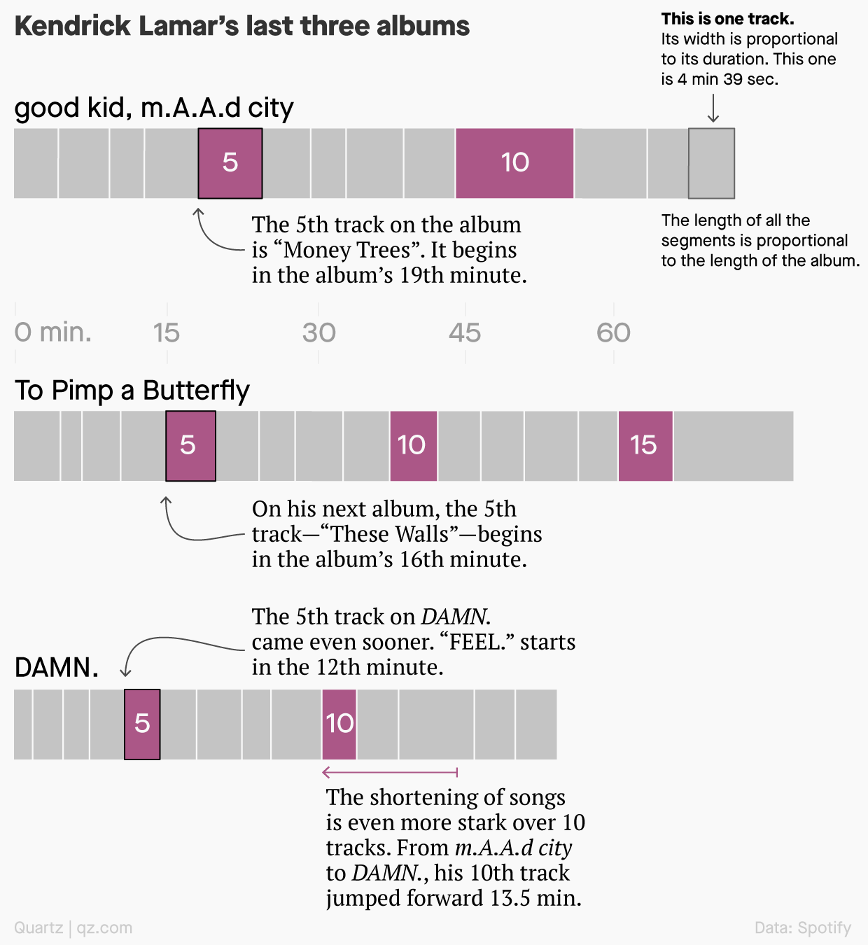 Quartz опубликовал инфографику, на которой сравнил по длине треков три последних альбома Дрейка, Канье Уэста и Кендрика Ламара. Если средняя продолжительность композиции на альбоме «good kid, m. A.A.d city» (2012) составила 5,37 минут, то на последнем альбоме Ламара «DAMN.» (2017) она снизилась до 3,57 минут. Десятый трек на пластинке начинает звучать уже через 13,5 минут.
