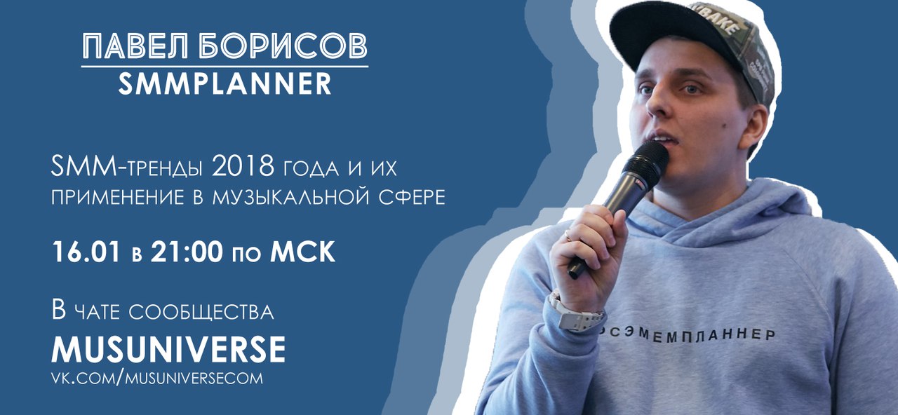 16-го января в 21:00 по Москве состоится онлайн-чат с SMM-специалистом и евангелистом сервиса SMMplanner Павлом Борисовым. Павел расскажет и ответит на вопросы об основных SMM трендах 2018-го года и их применении в музыкальной сфере. Организатор — сообщество Musuniverse.