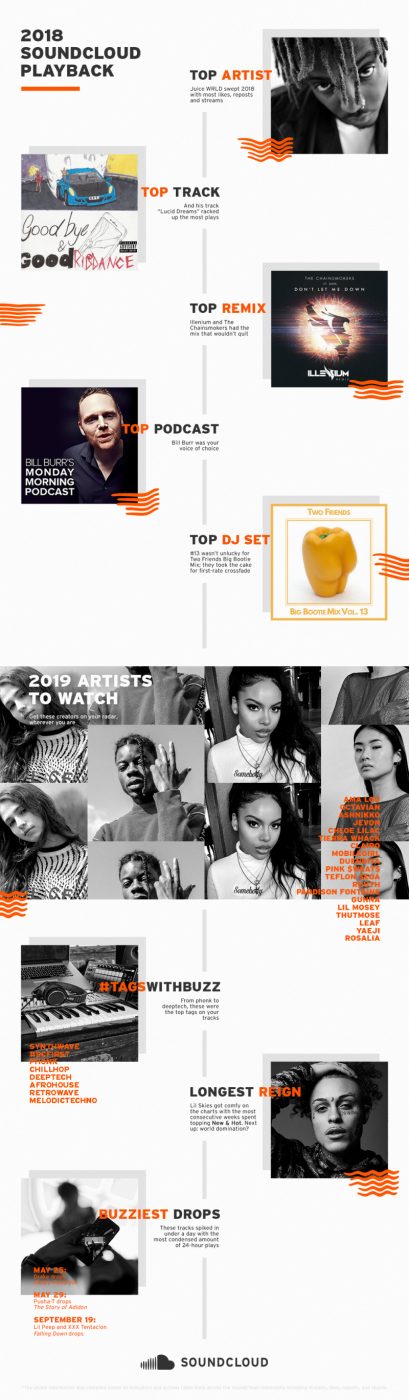 SoundCloud подвёл итоги 2018-го года и опубликовал плейлист с самыми популярными треками «SoundCloud Top Tracks Playback», а также плейлист с артистами, за которыми стоит следить в 2019-м году «Artists to Watch». Об этом сообщает официальный блог компании SoundCloud.