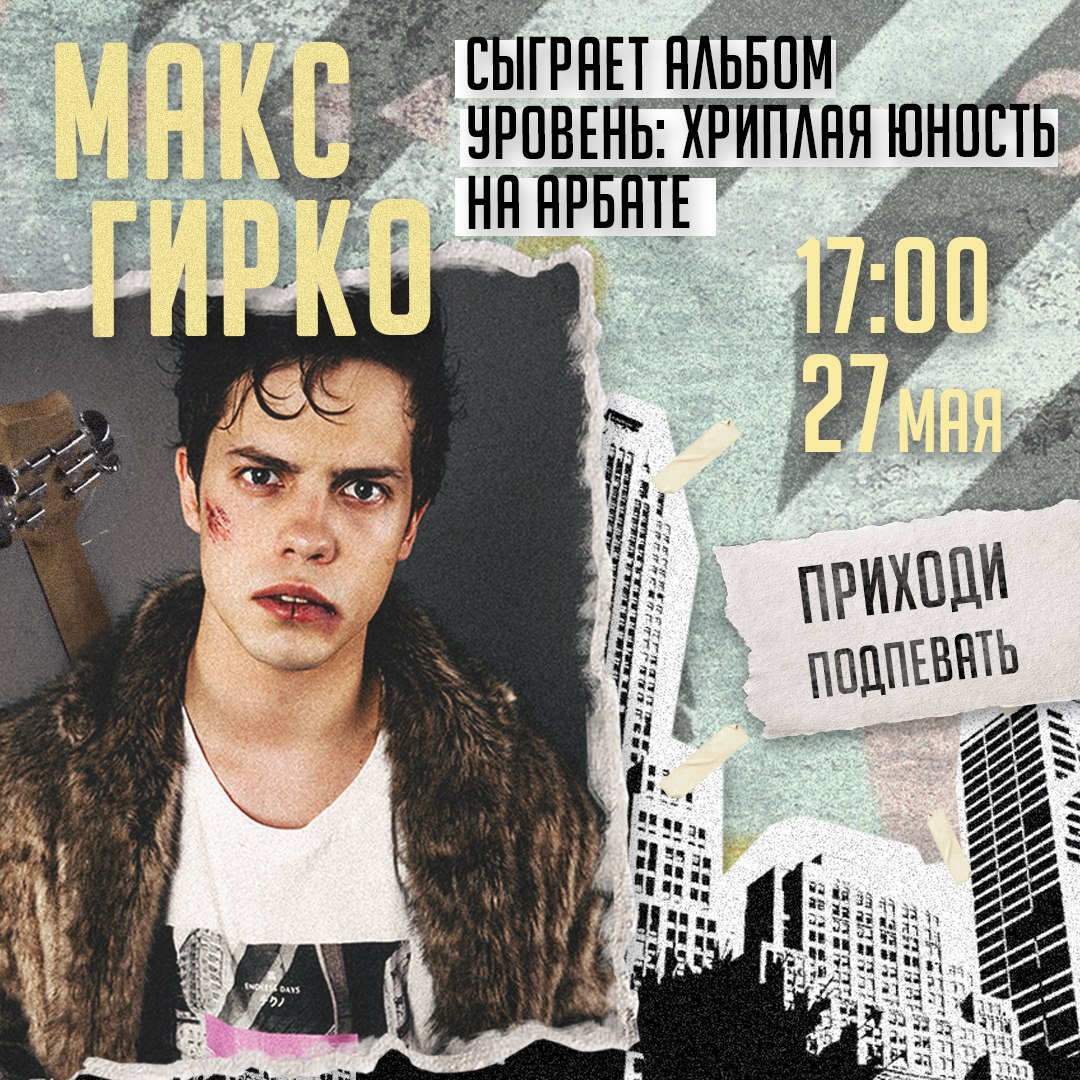 Макс Гирко пишет: зову вас 27 мая в 17:00 на старый Арбат, д.1, услышать, как я сыграю и спою альбом «Уровень: Хриплая юность».